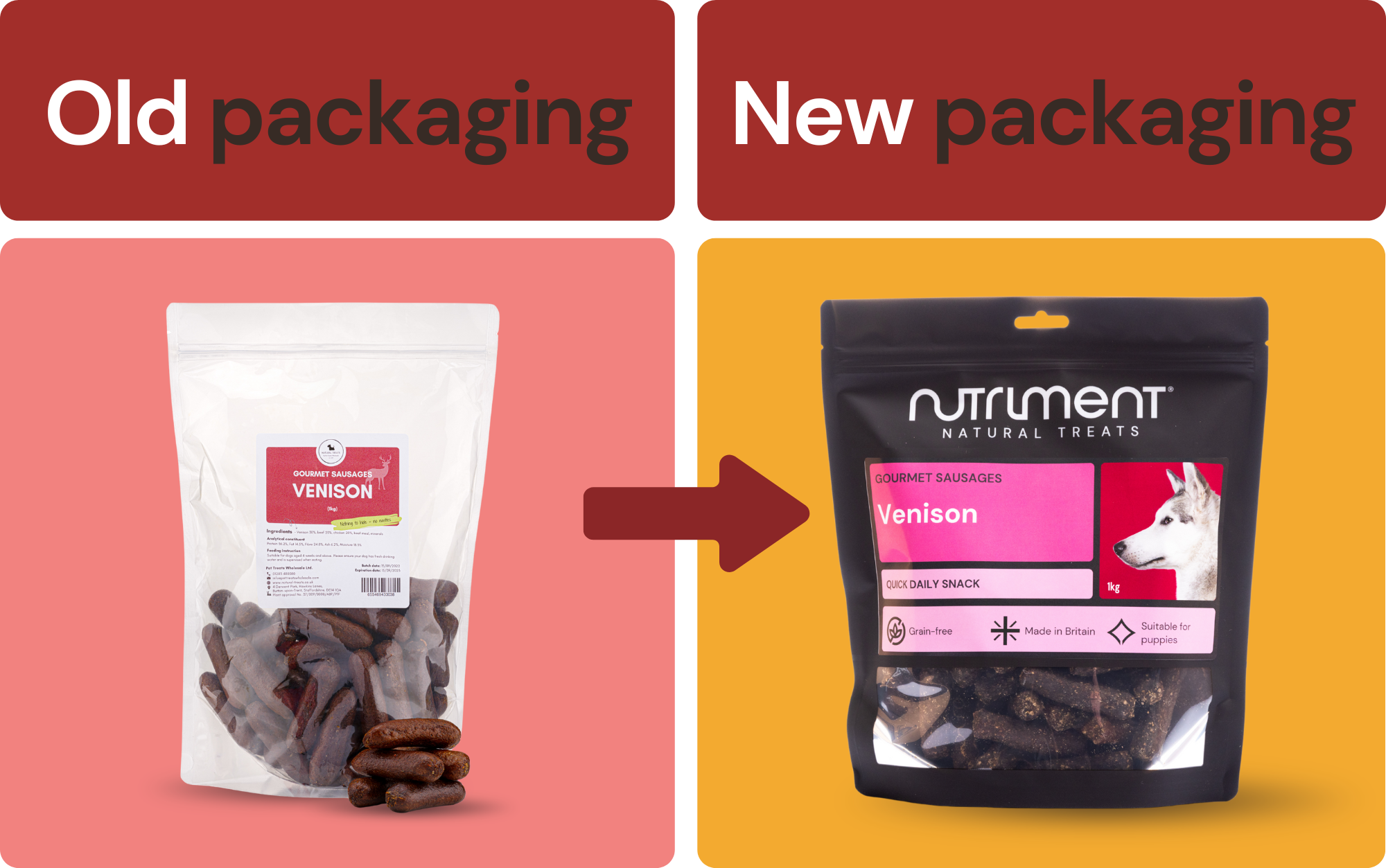 We've given our packaging a fresh new look - cleaner, more beautiful, and more retail-friendly packaging that pops on shelves. It also helps highlight what makes our range stand out - natural ingredients, quality you can see, and treats dogs love.