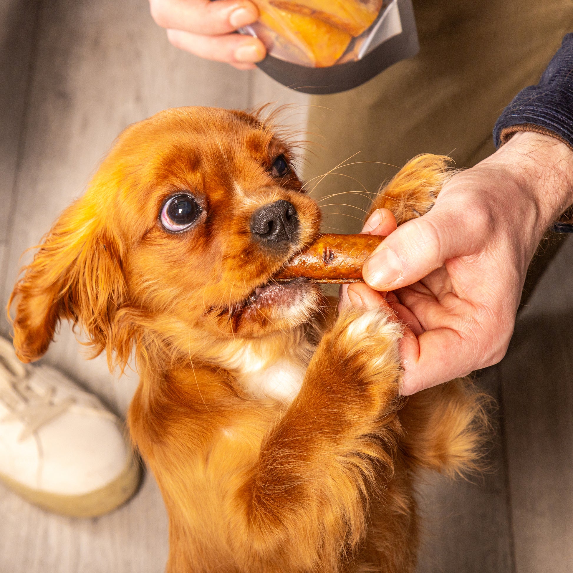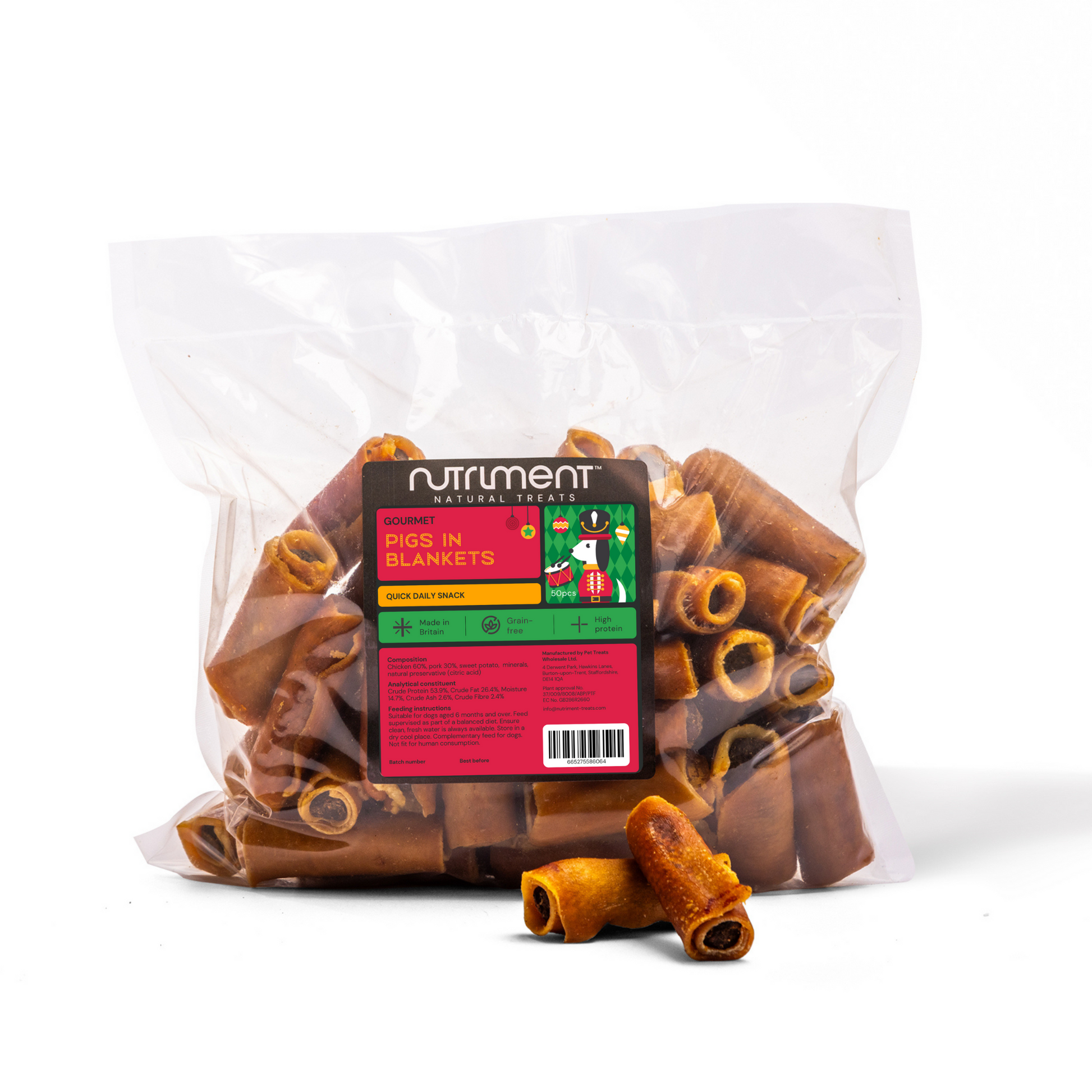 Christmas is just around the corner! Our Christmas gourmet chicken sausages, wrapped in pork rind, these delicious Pigs in Blankets are loved by dogs of all shapes and sizes. They are slow roasted in their own juices to ensure mouth watering taste in every bite!
