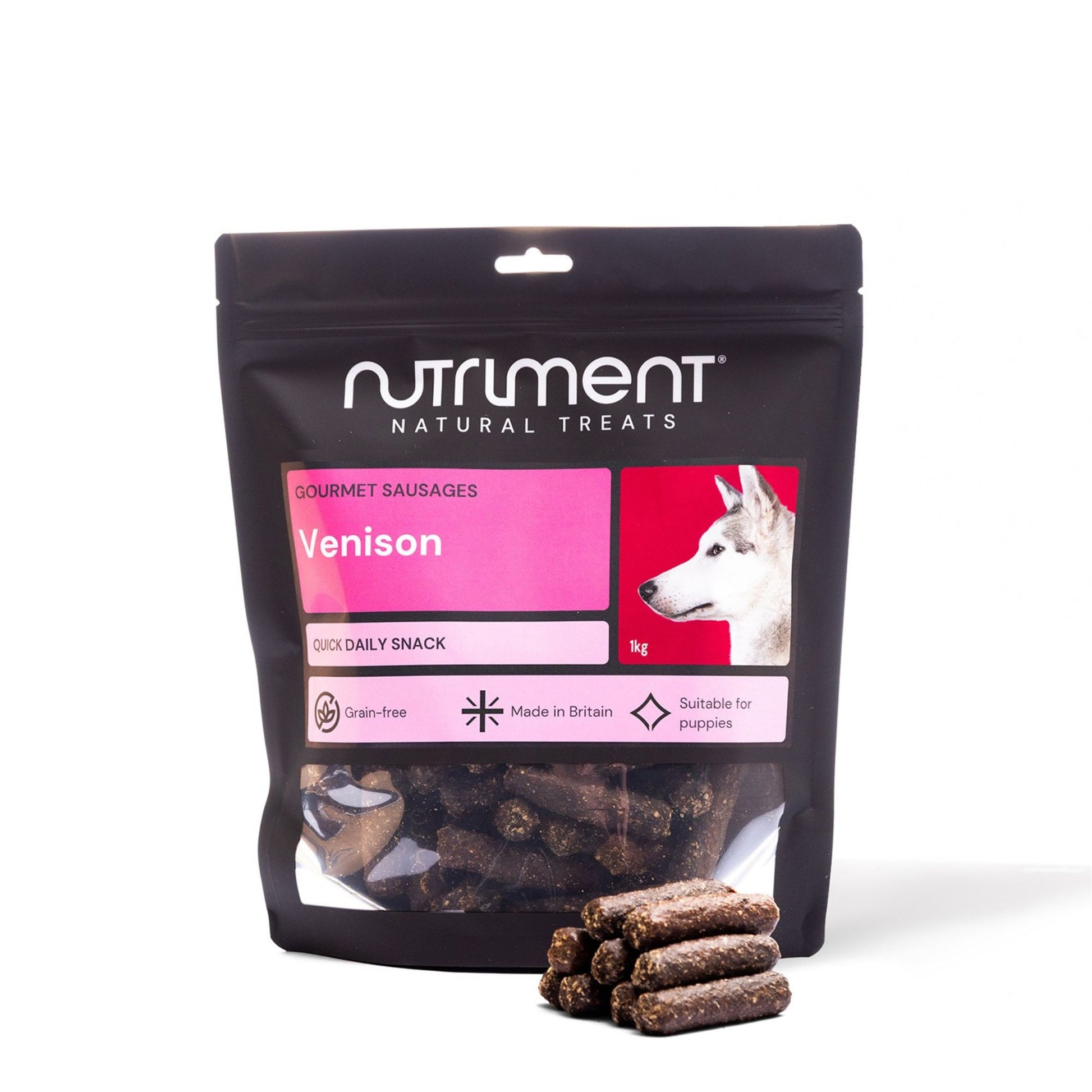 | Venison Sausages | Crude protein 36.2%, Crude oils and fats 14.5%, Crude fibre 24.8%, Crude ash 6.2%, Moisture 18.3% |