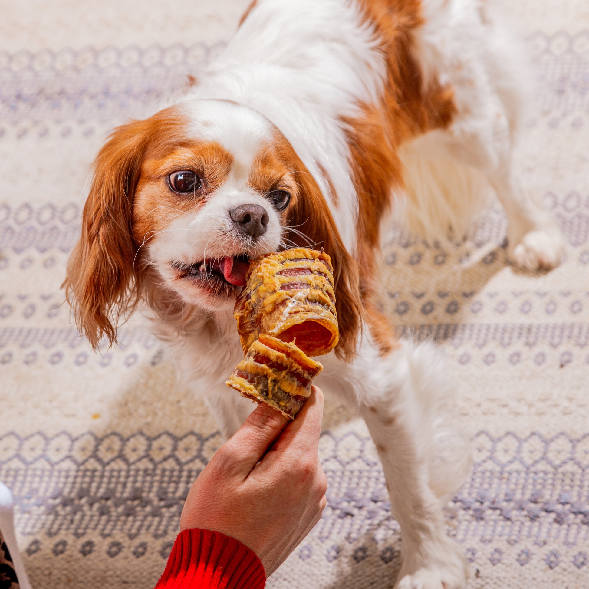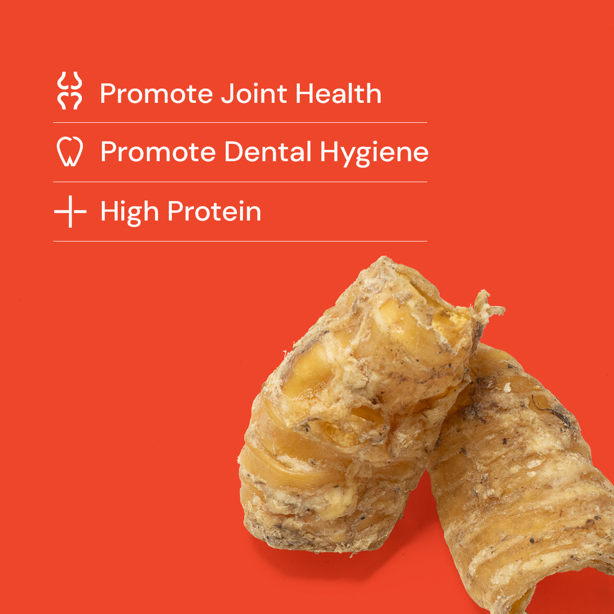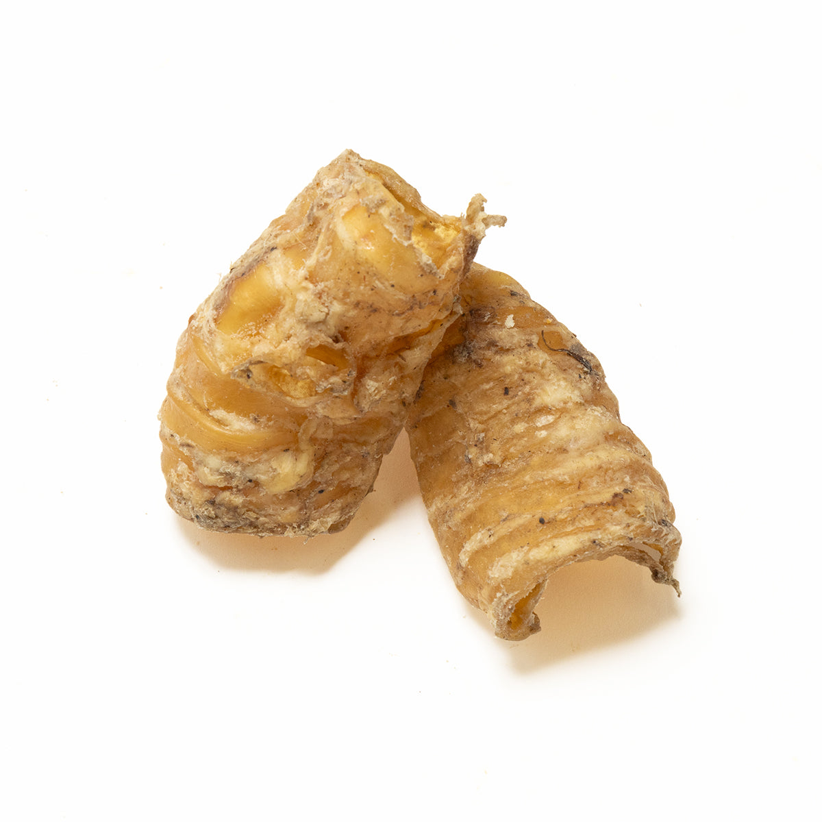 Our dehydrated Beef Curls are hollow chews made from the windpipe of a cow. Their shape allows them to be filled with a variety of other products, such as your dogs regular food, making them even longer lasting. The cartilage that lines the outside of the trachea is rich in glucosamine and chondroitin. The chewy texture of our Beef Curls can help promote dental health by reducing plaque and tartar buildup as your dog chews, leading to fresher breath and healthier teeth.