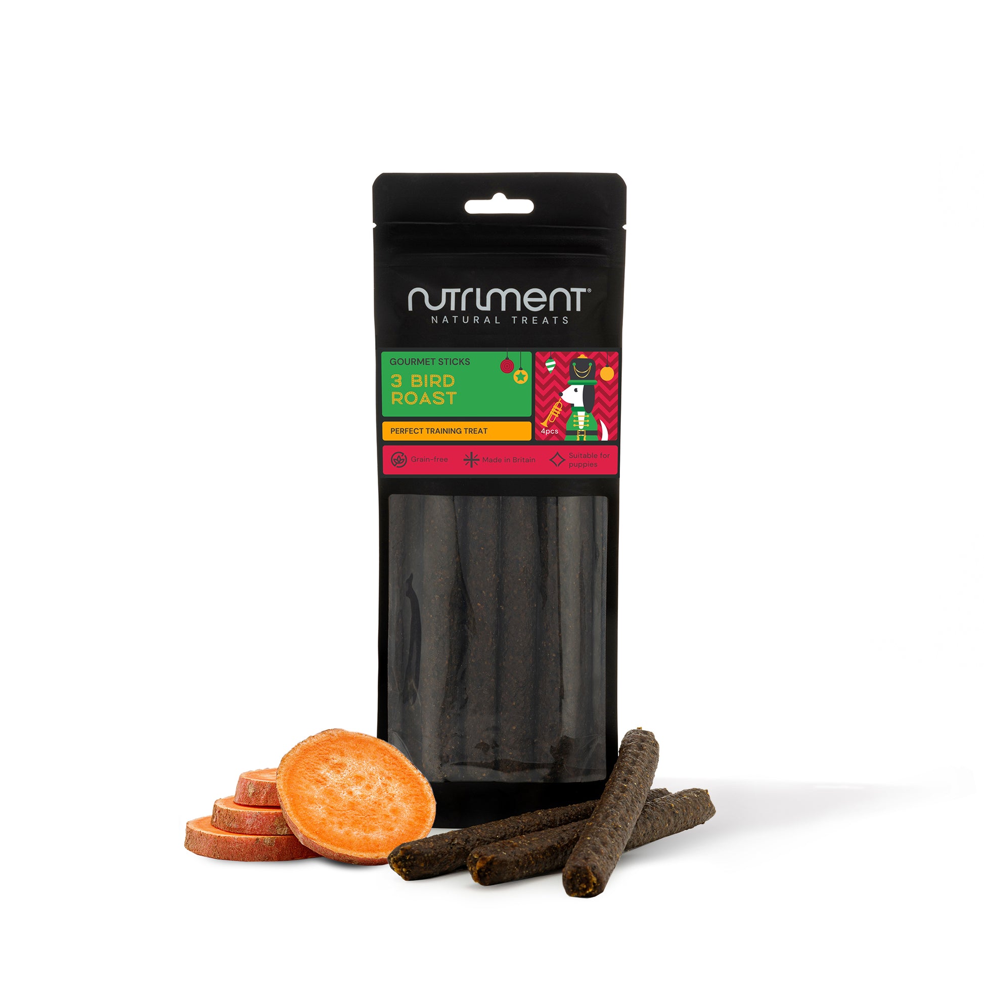 Our Gourmet Sticks are not only delicious but they’re healthy too! Ideal for dogs of all breeds and sizes, they’re also perfect as training treats for dogs with allergies, digestive issues or a sensitive stomach. BACK for Christmas 2025 are our delicious 3 Bird Roast, Turkey and Cranberry or Duck and Orange sticks.