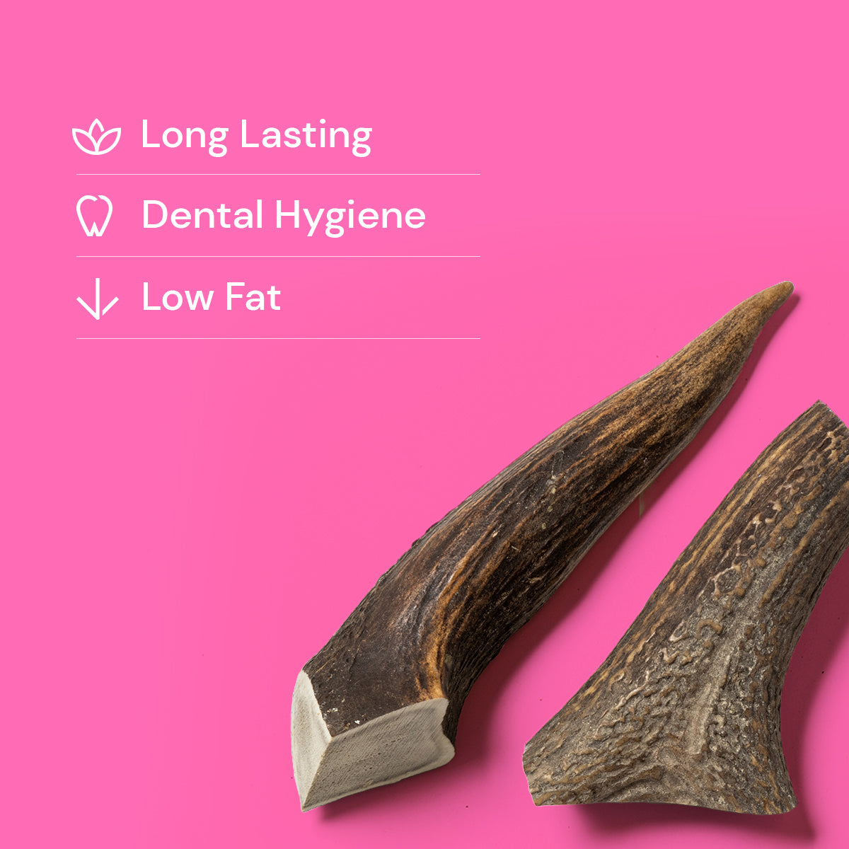 An extremely long lasting, natural alternative to dental sticks and chews, Antlers are an excellent source of entertainment for dogs of all sizes. Always supervise your dog with an antler and remove it immediately if large pieces break off.